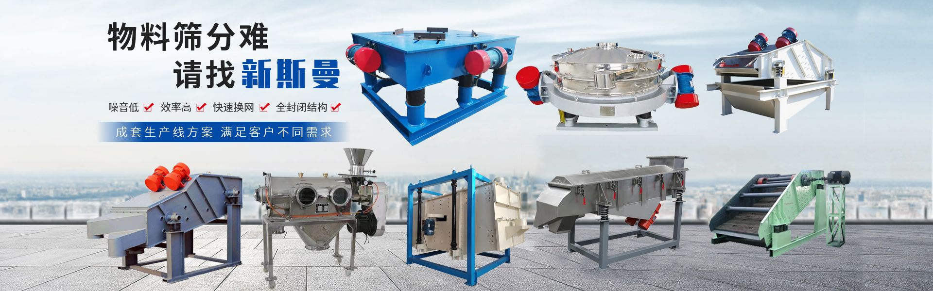 • 公司致力于研發(fā)定制各種標(biāo)準(zhǔn)及非標(biāo)篩分設(shè)備及配套生產(chǎn)線(xiàn),主要產(chǎn)品有XSM系列三次元振動(dòng)篩分過(guò)濾機(jī)、旋振篩、直線(xiàn)振動(dòng)篩、超聲波振動(dòng)篩、礦用振動(dòng)篩、圓振動(dòng)篩、直排篩、標(biāo)準(zhǔn)檢驗(yàn)篩(藥典篩)、搖擺篩、氣流篩、氣旋篩、過(guò)濾篩、拍擊式標(biāo)準(zhǔn)振篩機(jī)、振動(dòng)電機(jī)、螺旋輸送機(jī)、垂直提升機(jī)、振動(dòng)給料機(jī)、振動(dòng)平臺(tái)、高頻振動(dòng)平臺(tái)、倉(cāng)壁振動(dòng)器等等。