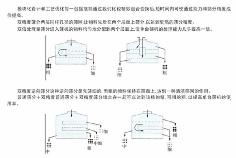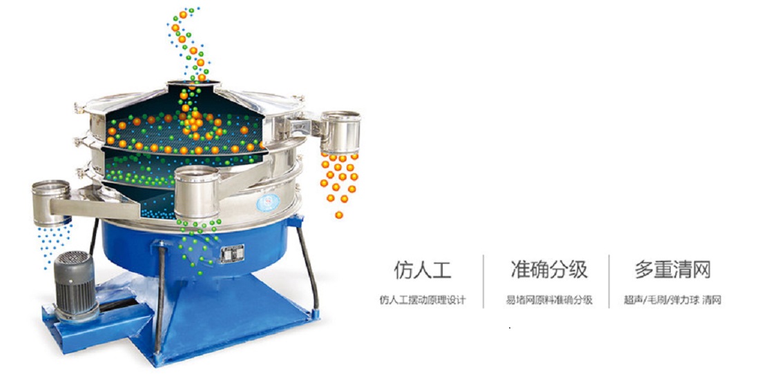 搖擺篩它采用仿生人工篩分的原理,將手工篩分動作的“篩”-(平面圓周運動)和“簸”-(向上拋物料)這兩種運動形式好的結(jié)合在一起,解決精細與超精細范圍的粉末與顆粒物料的篩分難題。