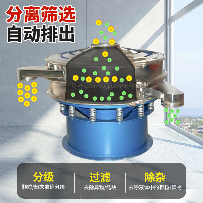 任何顆粒、粉末、粘液一定范圍內(nèi)均可篩選。篩分細(xì)至500目或0.028mm, 過濾小可至5微米。分級(jí)篩選,可篩一至五層篩網(wǎng),能同時(shí)進(jìn)行二至六個(gè)等級(jí)的分選或過濾。