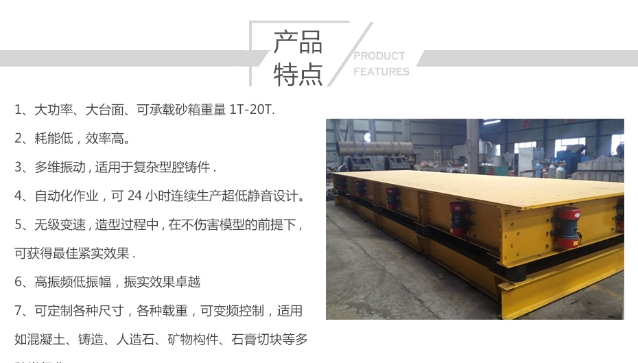 ◆大功率、大臺面;大功率7.5kw,激振力80KN,可承載10T。