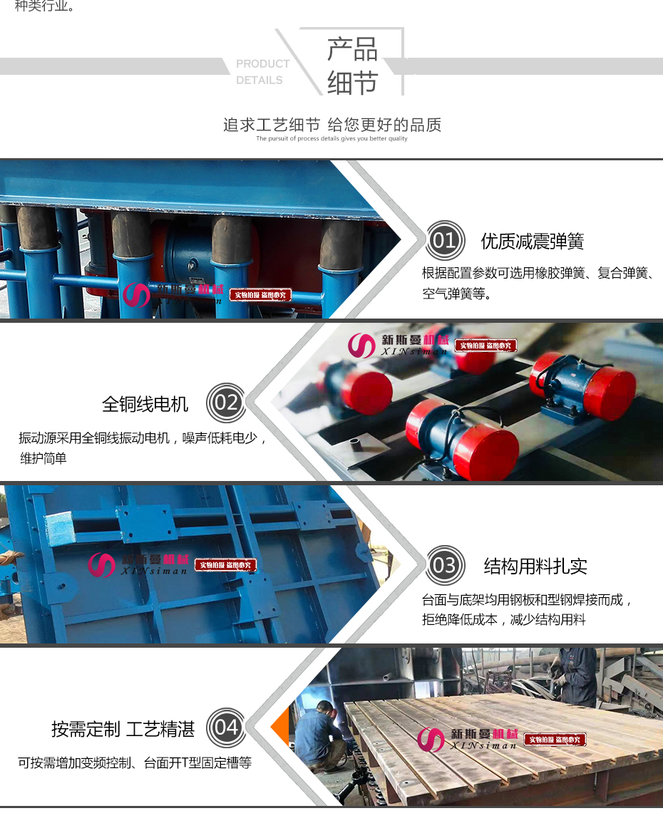 主要由臺底架、振動電機和彈簧等部件組成,臺面與底架均用鋼板和型鋼焊接而成,振動臺是用振動電機加一對相同的偏心輪組成。