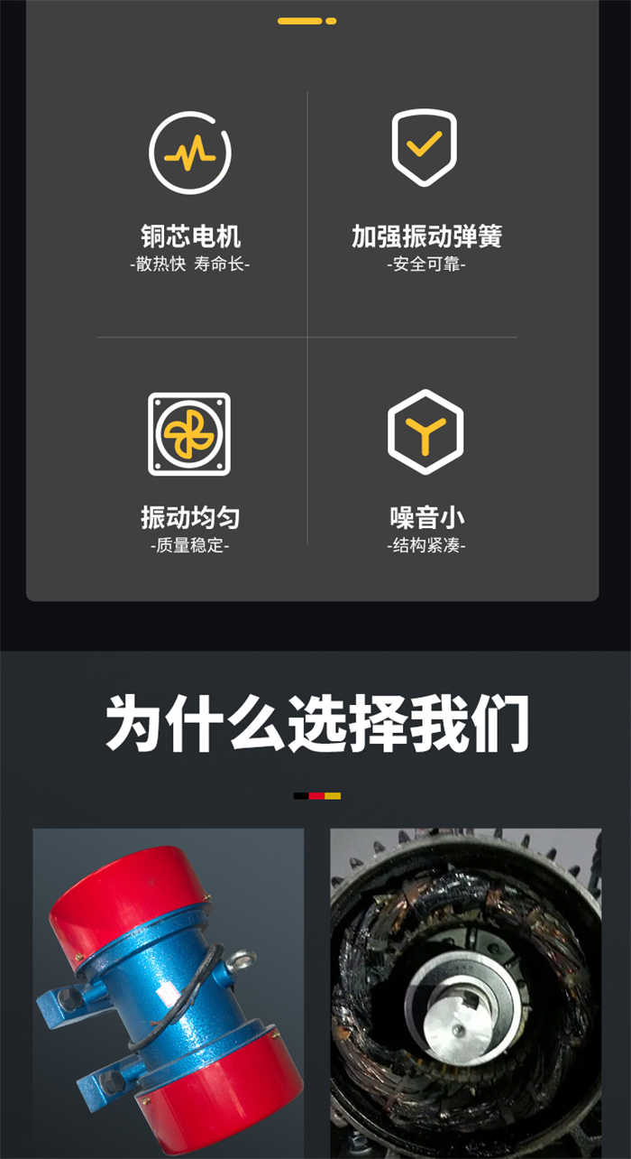 2、振蕩電機為激振源,噪聲低、耗電小、保護簡略。