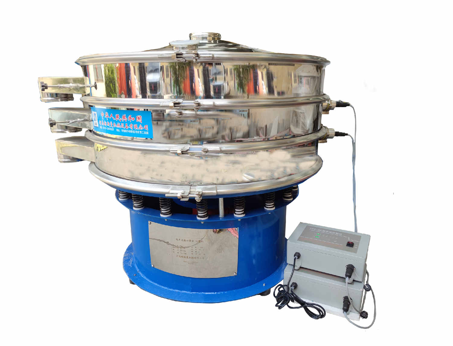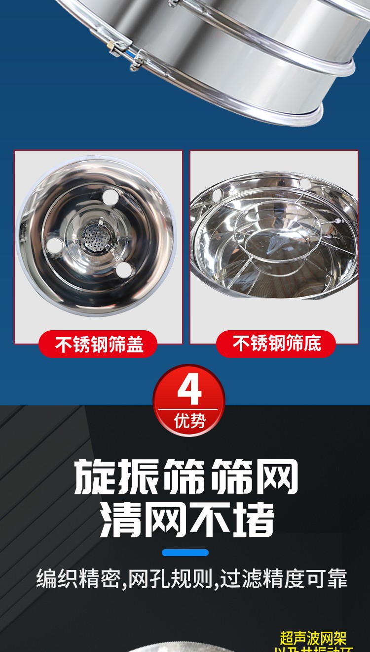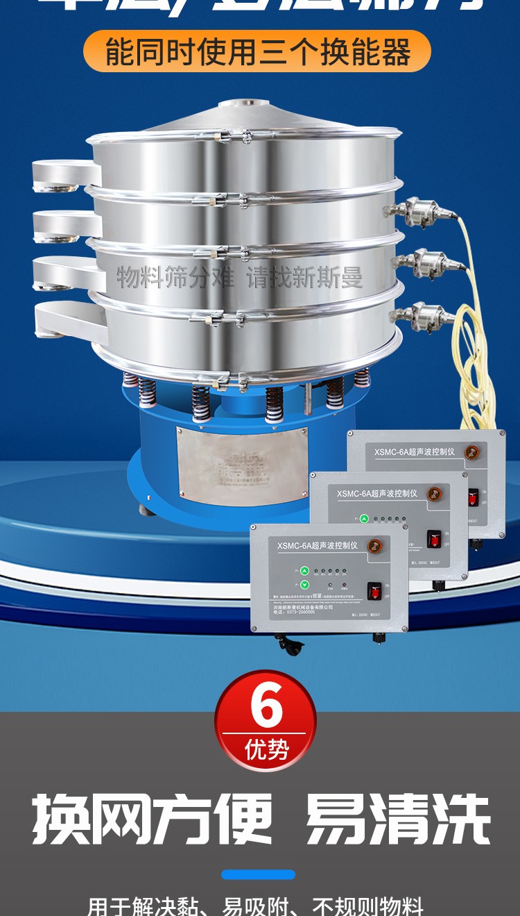 超聲波振動篩是在旋振篩的基礎上引入了超聲波清網(wǎng)裝置,通過將220V、50Hz或110V、60Hz電能轉(zhuǎn)化為18KHz的高頻電能,輸入超聲換能器,將其變成18KHz機械振動,從而達到高效篩分和迅速清網(wǎng)的目的,使超微細粉篩分成為易事。該系統(tǒng)在傳統(tǒng)的振動篩基礎上在篩網(wǎng)上引入一個低振幅、高頻率的超聲振動波(機械波),以改善超微細粉體的篩分性能。特別適合高附加值精細粉體的用戶使用。超聲波篩分系統(tǒng)是一種簡單實用、可靠的篩分系統(tǒng),是當前網(wǎng)孔堵塞的有效的解決方法??蓮V泛應用于制藥、冶金、化工、選礦、食品等要求精細篩分過濾的行業(yè),篩分過濾精度高,有效解決因團聚、靜電、強吸附性卡堵網(wǎng)孔等篩分難題,是國內(nèi)篩分行業(yè)的一項重大技術(shù)突破。