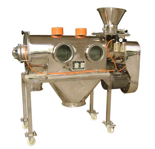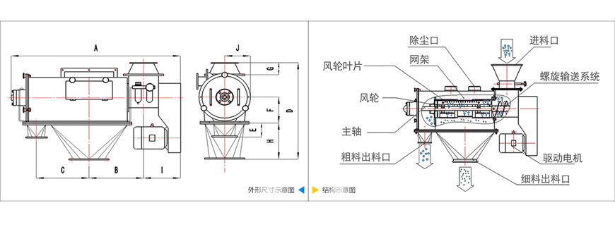 本設(shè)備篩網(wǎng)為圓筒狀,置于機(jī)體內(nèi),物料通過螺旋輸送系統(tǒng)后與氣流混合、霧化進(jìn)入網(wǎng)筒內(nèi),通過網(wǎng)筒內(nèi)風(fēng)輪葉片使物料同時(shí)受到離心力和旋風(fēng)推進(jìn)力,從而使物料噴射過網(wǎng),過網(wǎng)的物料從細(xì)料排出口排出,不能過網(wǎng)的物料沿筒壁從粗料排出口排出,達(dá)到快速分離的目的。